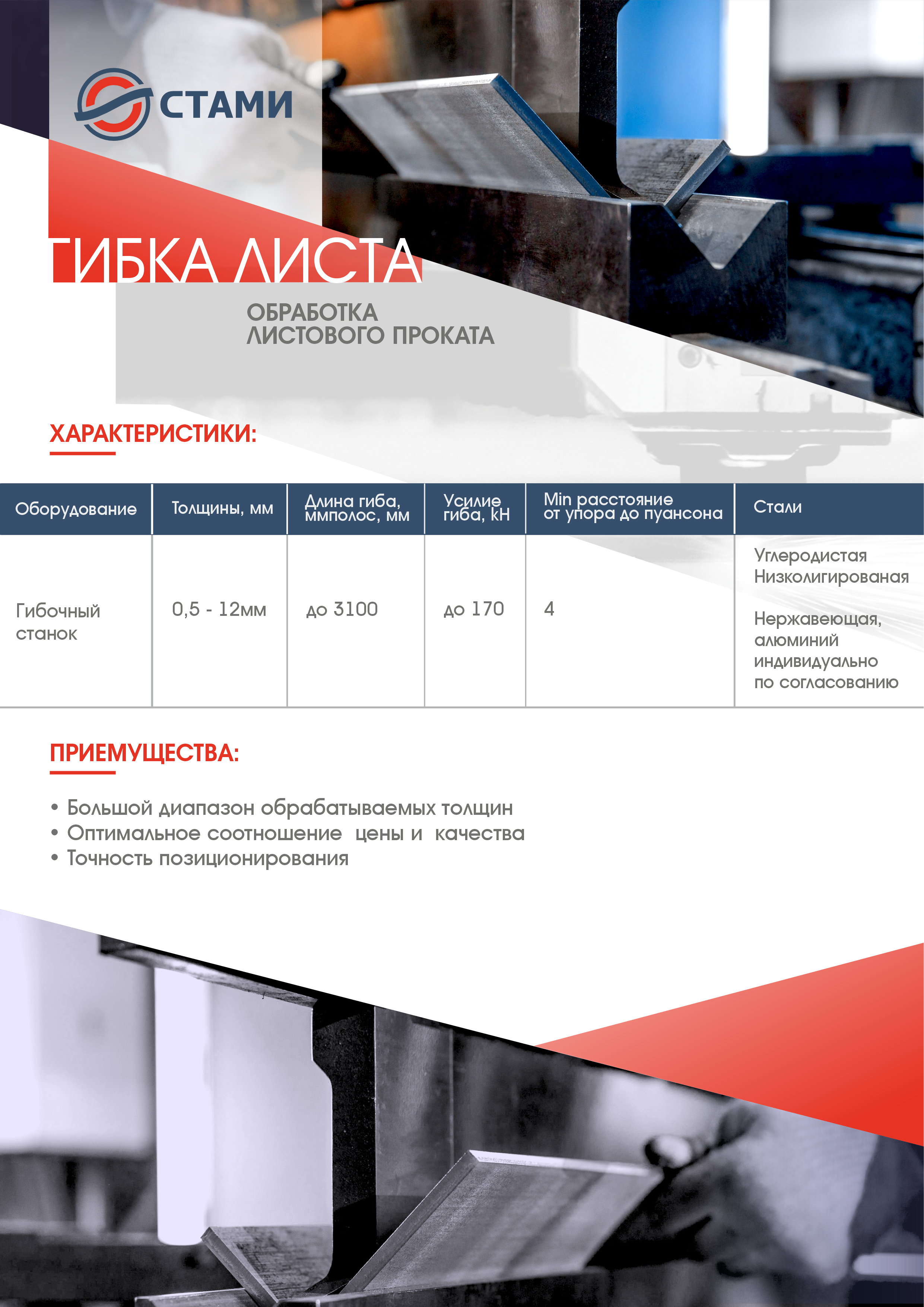 СМЦ «Стами» производит равнополочный и неравнополочный швеллер гнутый (металлический профиль с П-образной формой сечения) из штрипса на автоматической линии холодного профилирования способом холодной прокатки толщиной от 2 до 6 мм с шириной основания швеллера от 50,0 мм до 300,0 мм и длиной до 12 метров.